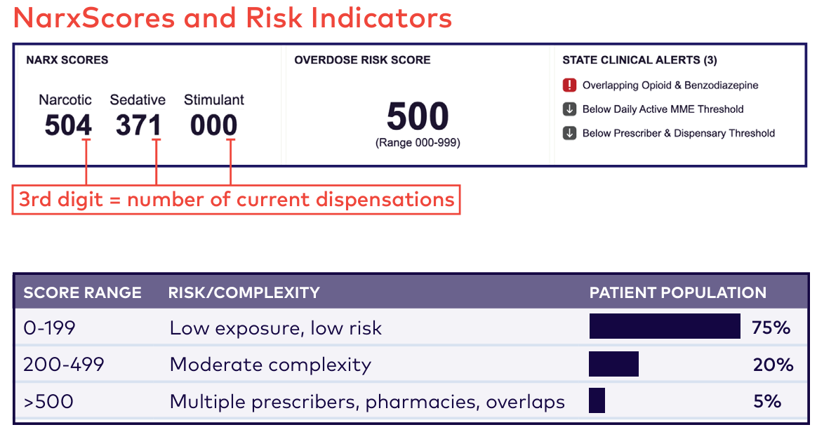 A good example of this issue is NarxCare, which as Szalavitz (2021) reported, is designed to “automatically identify a patient’s risk of misusing opioids” (para. 11). The system relies on machine-learning algorithms that analyze vast amounts of data—including information outside of state drug registries—to generate risk scores and visualizations (see image below for a snapshot of two examples)7 .