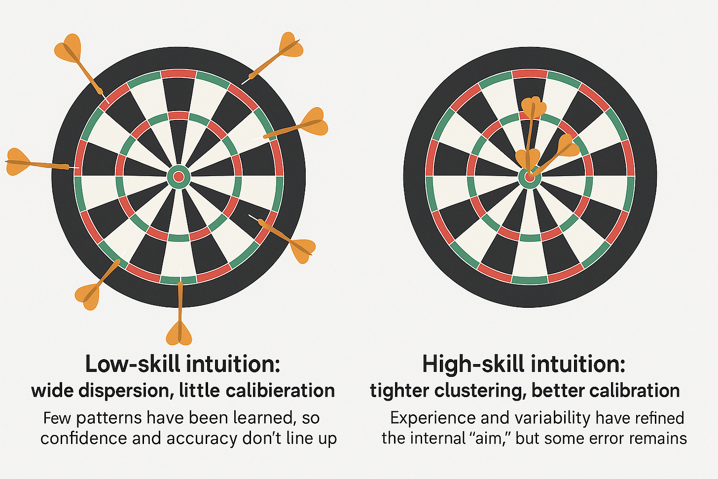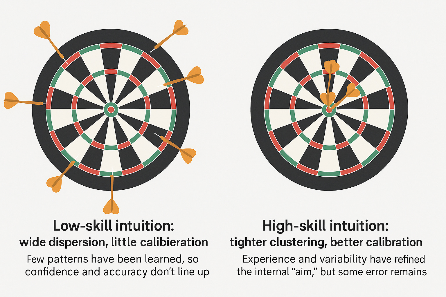 Think of intuition like throwing darts (my apologies for jumping sports briefly, but I couldn’t come up with a terrific baseball metaphor here). Each intuitive judgment is a throw. For novices, the darts scatter—some hit the board, some miss entirely. As expertise and varied experience grow, the throws start clustering closer to the center. They never land in exactly the same place, but the pattern tightens. That spread matters. Even skilled intuition produces variance—it just does so around a more reliable target.