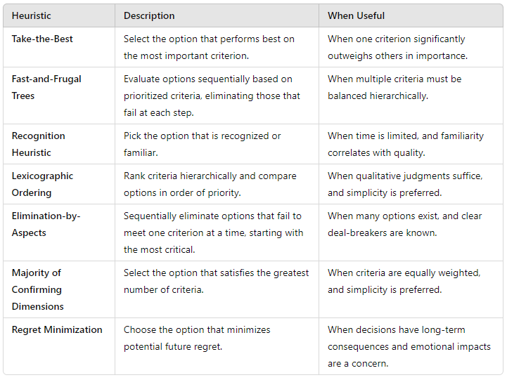 While this table only scratches the surface, it highlights the remarkable diversity of heuristic strategies. Some heuristics, like Take-the-Best, are highly focused, making them ideal for situations where a single criterion dominates. Others, such as Fast-and-Frugal Trees or Lexicographic Ordering, help balance multiple factors, depending on whether simplicity or precision is prioritized.