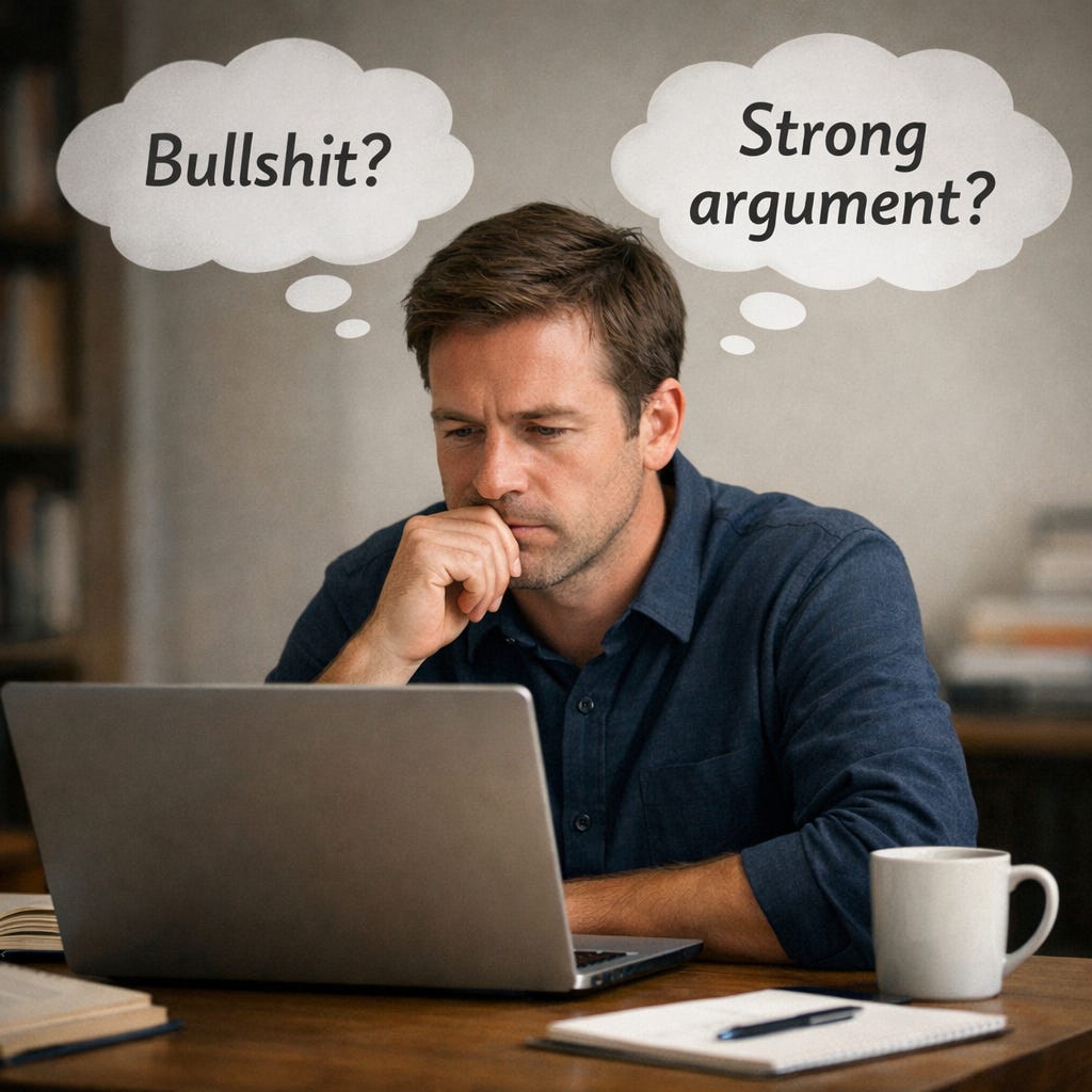 Others have reacted in the opposite direction. They’ve become skeptical of anything that sounds like it might have been generated or smoothed by AI—em dashes, balanced phrasing, careful hedging, the whole familiar aesthetic. That skepticism can feel like vigilance. But it’s still a shortcut. And like the one it replaces, it’s weak. Treating “AI-ish” prose as a proxy for weak thinking risks dismissing work that’s careful but stylistically conventional, while letting genuinely empty arguments through if they learn to present themselves differently.