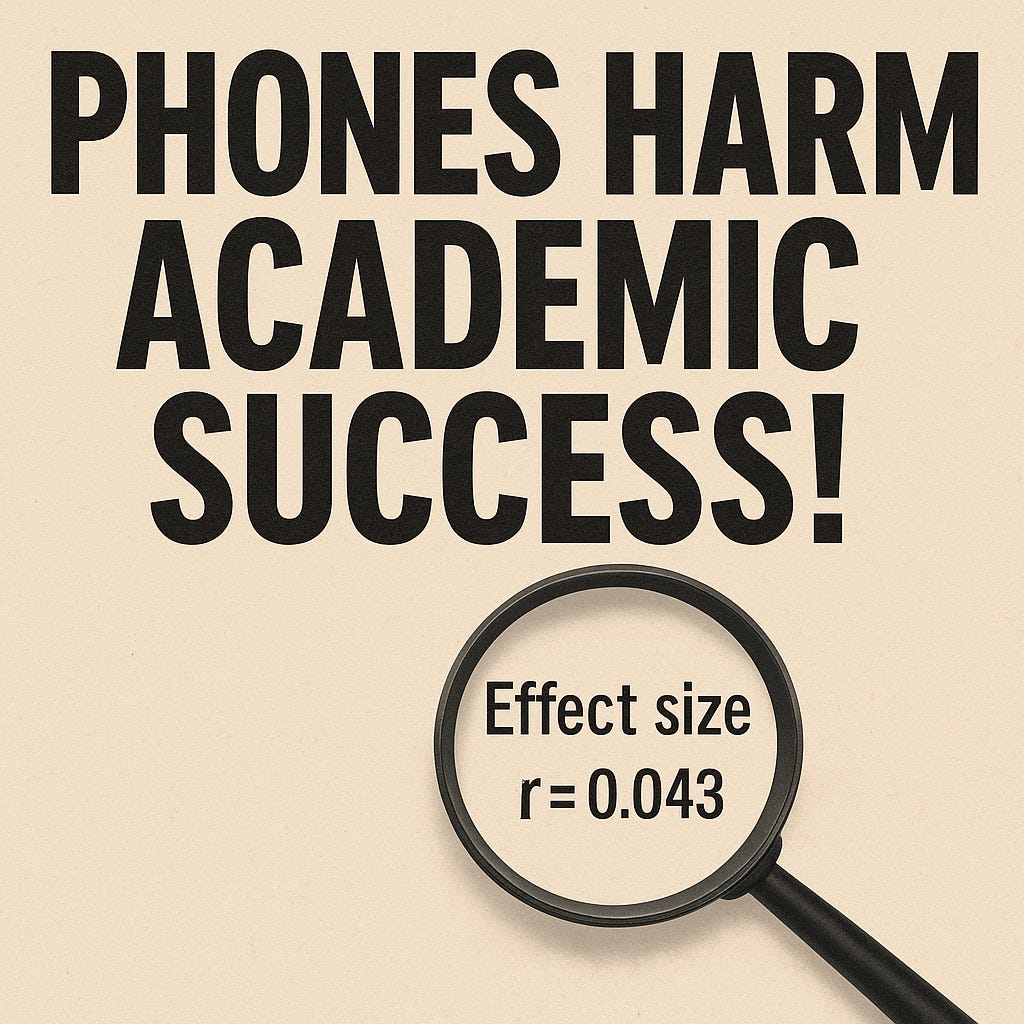 In practical terms, that’s negligible. And the researchers found no significant changes in well-being, academic motivation, online harassment, or overall digital use. Still, it’s not hard to imagine how “phone bans show only tiny effects on grades” becomes “removing phones boosts academic performance” in headlines and policy debates. The story fits an existing cultural concern about phones and attention, and once it’s framed that way—helped along by the study’s own title—the small effect becomes a footnote rather than the focal point.
