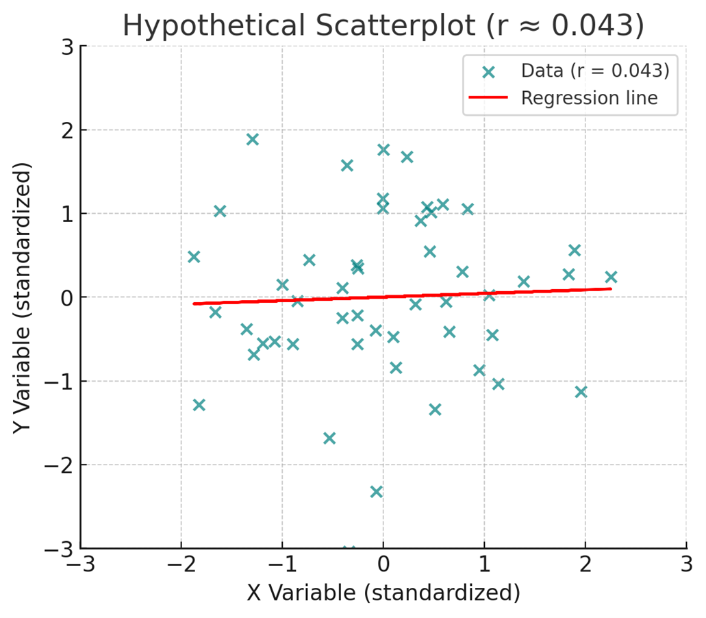 All it takes is for a result to be easy enough to fit into a conclusion that aligns with an existing moral panic. Consider a recent randomized controlled trial involving more than 17,000 students, testing whether removing phones from classrooms would improve academic performance (Sungu et al., 2025). The study did find a statistically significant improvement in grades—but the effect size was miniscule (d = 0.086), which, in keeping with our correlational visuals is equivalent to a correlation of about r = 0.043 (see Figure 2).