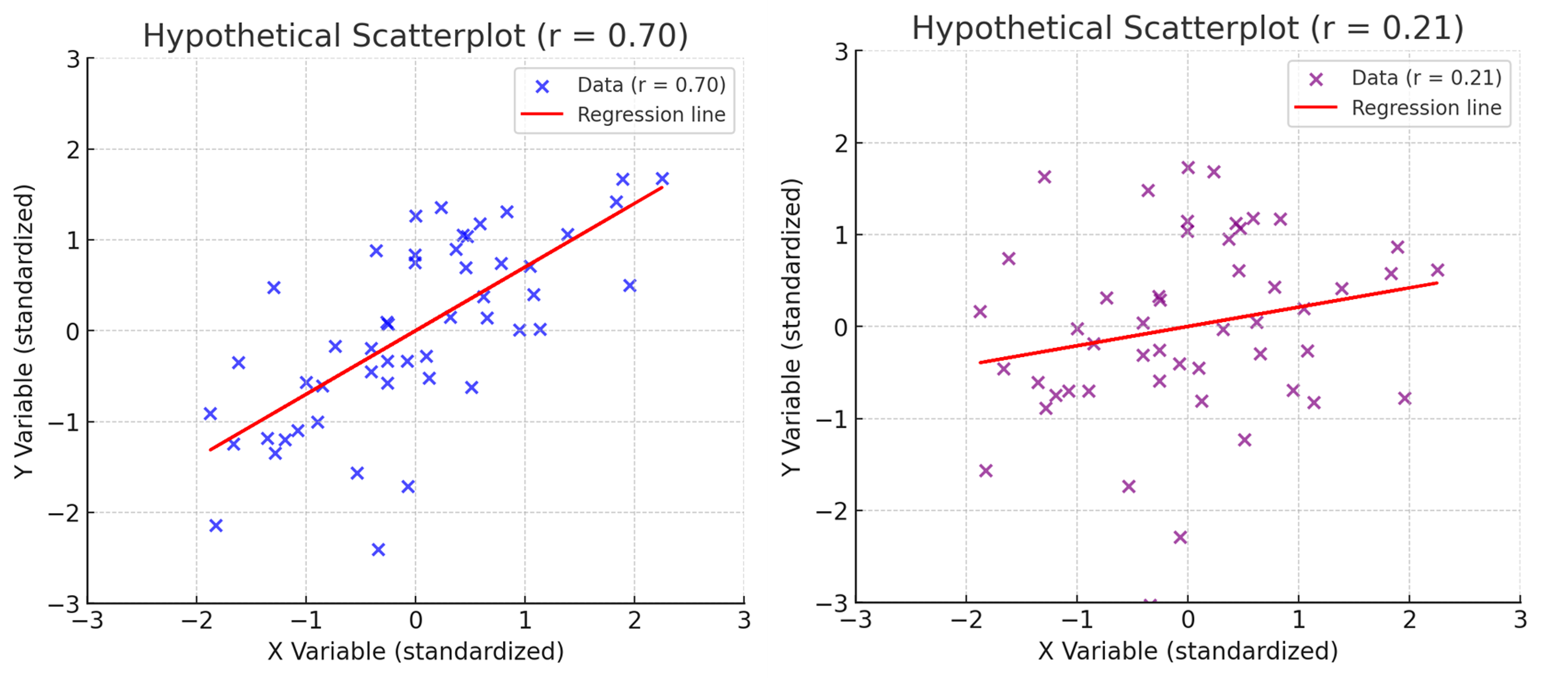 He illustrates this with a couple of graphics—and I asked ChatGPT to produce two similar examples that used the exact same scaling for each1 (see Figure 1)—representing two different correlational effects. With the first chart, the trend is obvious: people at the low and high ends differ noticeably, though there’s still some random variability (noise).