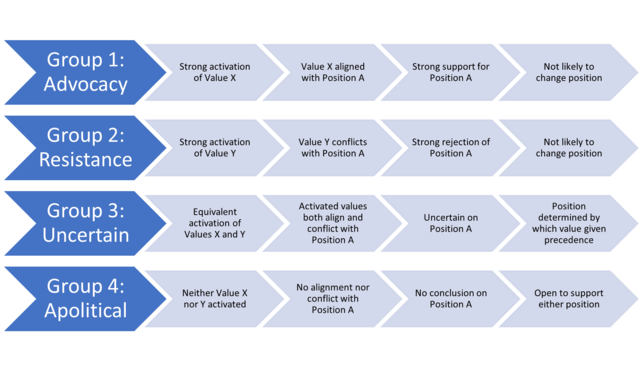 We could complicate this by expanding the number of values that are strongly activated. This would lead to substantially more than 4 groups. This regularly occurs when, for example, politicians will endorse one aspect of a bill but not another aspect of it. This likely results from the moderate to strong activation of one or more values that are aligned with the position but also one or more values that conflict with it. Thus, Group 3 might become Group 3A, Group 3B, etc.